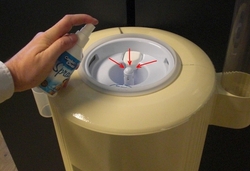 Tevens is het voor een goede hygiëne van de watercooler belangrijk dat de cooler vrij blijft van bacteriën. Gebruik daarom bij elke nieuwe fles de Cooler Clean Spray en spuit zowel de pin van de cooler als de dop van de fles goed in. Hierdoor voorkomt u dat de cooler van buitenaf wordt verontreinigd met bacteriënof virussen.