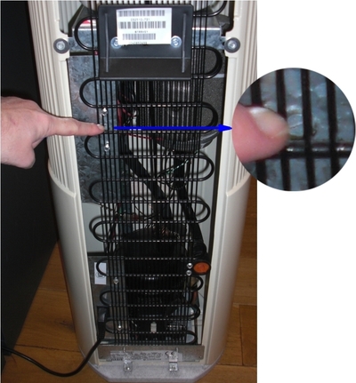 Indien het water in de cooler is bevroren zal dat de uitloop van het koud water tappunt verhinderen. Als dat het geval is (er komt bijvoorbeeld wel water uit het lauwe tappunt maar niet uit het koud water tappunt) dan moet het water in de cooler afkoelen. Trek hiervoor de stekker gedurende ca. 4 uur uit het stopcontact en controleer daarna of het koud water tappunt weer water geeft. Als dat het geval is kunt u zelf de thermostaat terug draaien om de koelunit naar een hogere temperatuur af te stellen. Pak hiervoor een kleine schroevendraaier (spanningzoeker) en draai de thermostaatschroef tegen de klok in terug. U vindt de stelschroef aan de achterkant van de cooler (zie foto).