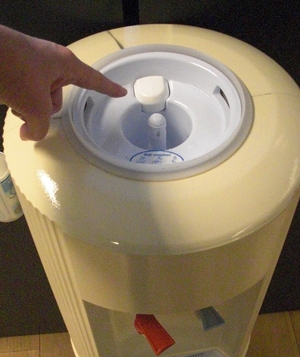 Elke fles wordt afgesloten met een kapje dat in de dop zit (deze blijft op de pin zitten als u een fles op de cooler zet) zodat de fles bij het plaatsen/vervangen niet lekt. Daarom is het belangrijk dat de fles recht op de pin van de cooler gezet wordt. Uiteraard is een fles best zwaar om op de cooler te plaatsen maar als dat niet correct gebeurd kan het afsluitkapje van de dop eruit schieten waardoor er lekkage kan ontstaan of het luchtfilter kan nat worden (zie bovenstaand voor de gevolgen).
